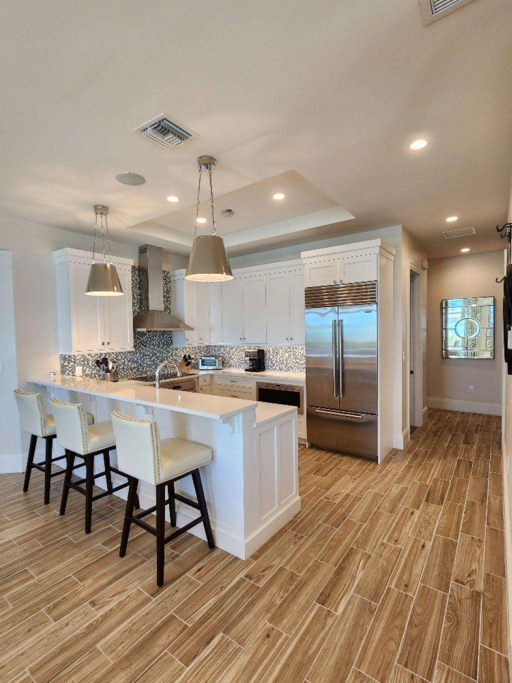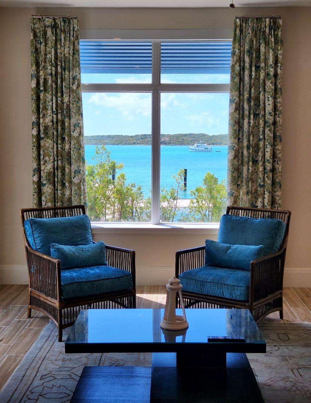The condo’s well-appointed, gourmet kitchen features custom designer wood cabinetry, stainless appliances, exquisite granite countertops, a 12' breakfast bar, and indoor/outdoor dining and seating areas so you can choose where to enjoy one of the most fabulous views Exuma has to offer.